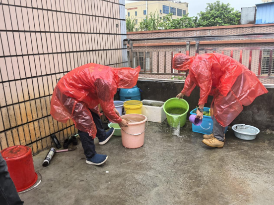 暴雨过后,消杀组对3050㎡绿化带、下沉广场、天面、探究活动室进行二次补药,确保雨后再无孑孓孳生。