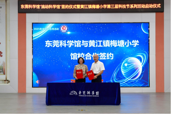 签约仪式上,东莞科学馆与黄江镇梅塘小学正式签订“馆校合作”协议,携手翻开科学教育创新发展的新篇章,致力于为学生打开科学视野,让科学魅力点亮校园生活。