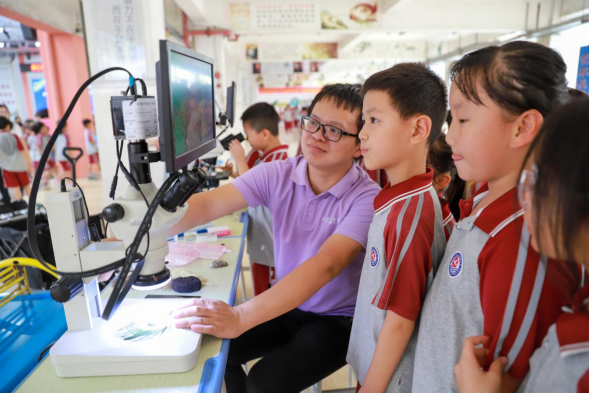 在自然科学探究活动中,辅导员引导学生使用生物显微镜观察植物表皮细胞。通过观察,学生们既能清晰地看见表皮细胞的结构,体验微观世界的奥妙。