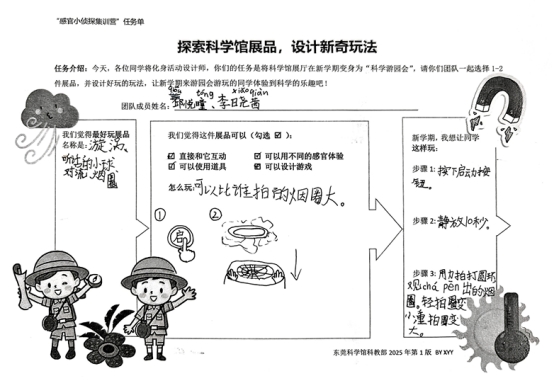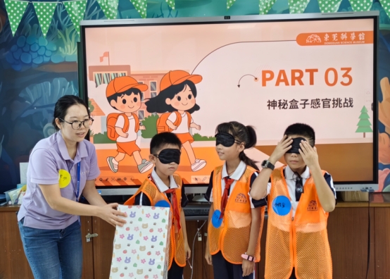 早在暑期启动前,东莞科学馆就和东莞市莞城中心小学达成共识,确定新学期大规模研学新模式——从各班挑选“小小科学辅导员”,带领组员完成研学任务。为确保“小辅导员”具备带队能力,同时探索更贴合儿童需求的研学形式,“感官小侦探系列活动”应运而生,搭起“基础体验——创新实践——方案落地”的培育链条。