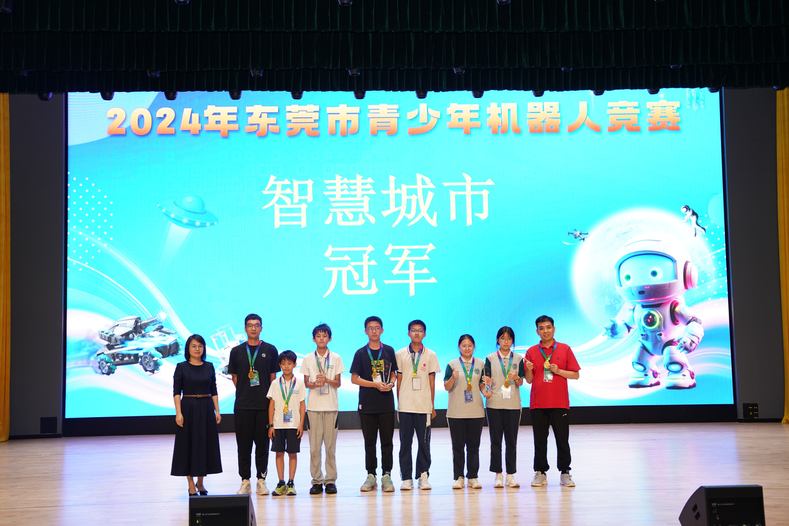 “智慧城市”项目由东莞市松山湖第一小学舒彦杰、申子健获得小学组冠军,东莞市樟木头中学邱柏恺、李瀚涛获得初中组冠军,东莞市众美中学阮廷玉、罗铭柳获得高中组冠军。