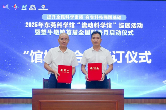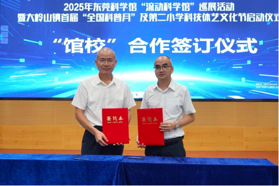 在活动启动仪式上,东莞科学馆分别与望牛墩镇新联小学、大岭山镇第二小学成功举行“馆校合作”基地签约授牌仪式,标志着双方将在科学教育领域深度合作正式开启,未来将共享科普教育资源、创新教育模式,助力学生提升科学思维与创新能力。