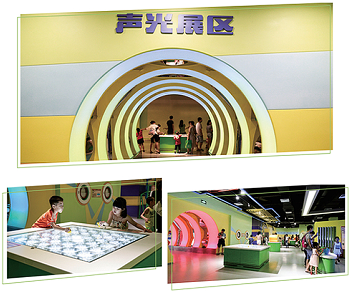 穿过炫彩的轨道,展区内“彩色的影子”“迷宫”等29件展品直观地演示了频闪、光的折射和反射、平方反比定律、普氏摆等声光学原理或现象。