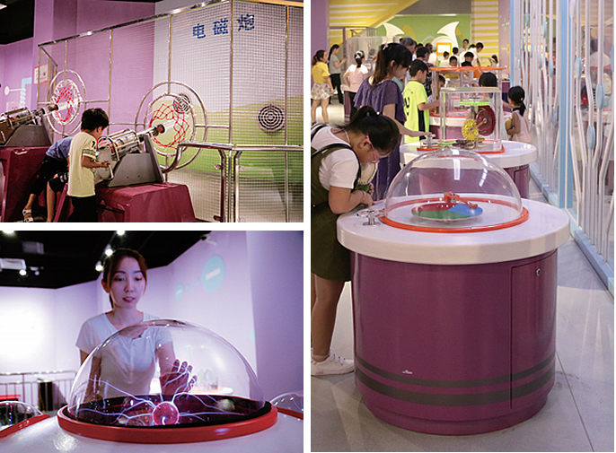 展区共有展品27件,演示了欧姆定律、直流电机、磁悬浮、静电、尖端放电、电池原理、地磁场等经典物理学原理或现象,让游客感叹电磁的神奇。