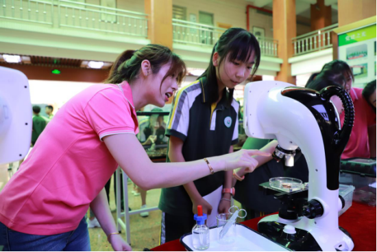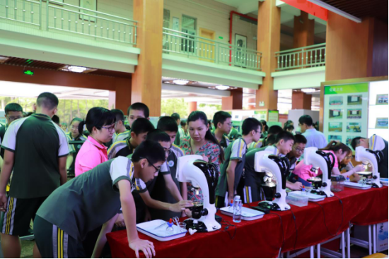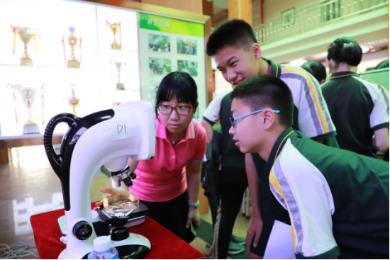 ▲学生通过显微镜观测昆虫细胞结构