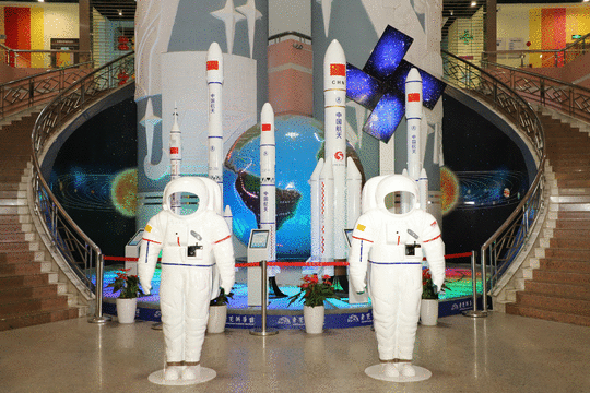你可以看到中国发射的第一颗人造地球卫星东方红一号和我国航天成就图片展板,回眸中国航天砥砺奋进的历程。