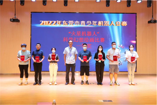 东莞科学馆副馆长卢懿健(右四)与竞赛获奖队伍合影