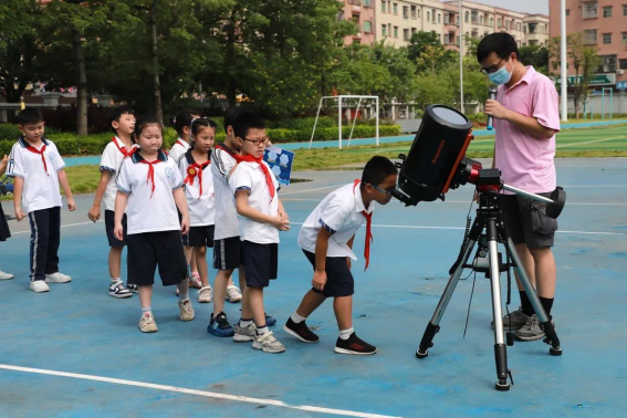 在天文老师的带领下,同学们使用口径20厘米的星特朗C8XLT施密特-卡塞格林式天文望远镜观测了太阳第3100与3102号黑子群,学习了太阳黑子的成因、活动周期、太阳活动对地球的影响等天文知识。