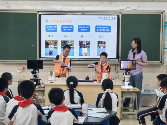 压轴好戏来了!科学馆辅导员与学生变身为化学研究员,大研究员辅导小研究员提取花青素,并引导他们细心酸和碱溶液瞬间变幻出红、蓝、绿等缤纷色彩!酸变红!碱变绿!孩子们兴奋记录,恍然大悟:原来花朵艳丽的色彩,是它们与大自然对话的化学密码和生存智慧