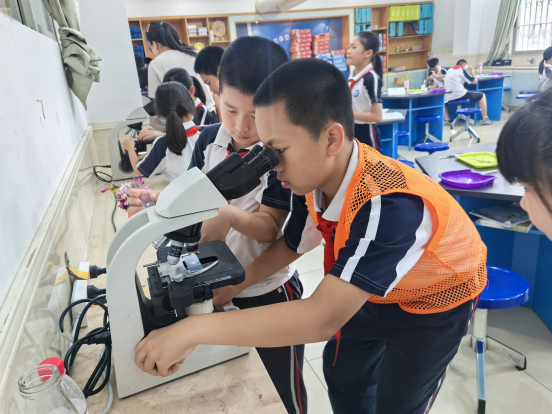 外观形态看清了?科学馆辅导员立刻接力登场!伴随着10台专业显微镜(含酷炫的体式镜!)的灯光亮起,课堂秒变微观结构探险营!辅导员指导学生制作临时装片和调节显微镜。当显微镜视野清晰聚焦的刹那,哇!花粉像小刺猬!”“花瓣细胞像彩色马赛克!的惊呼此起彼伏。(微观世界太上头!)