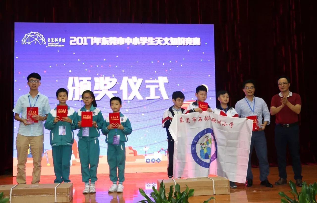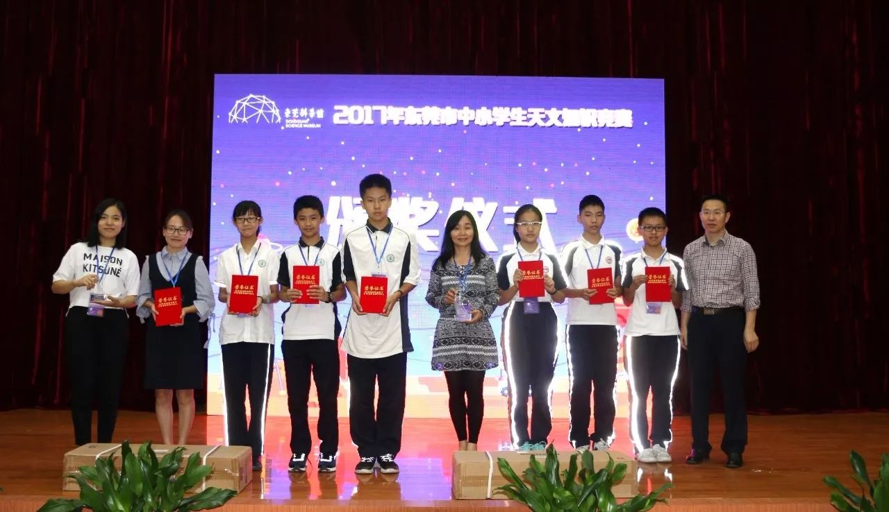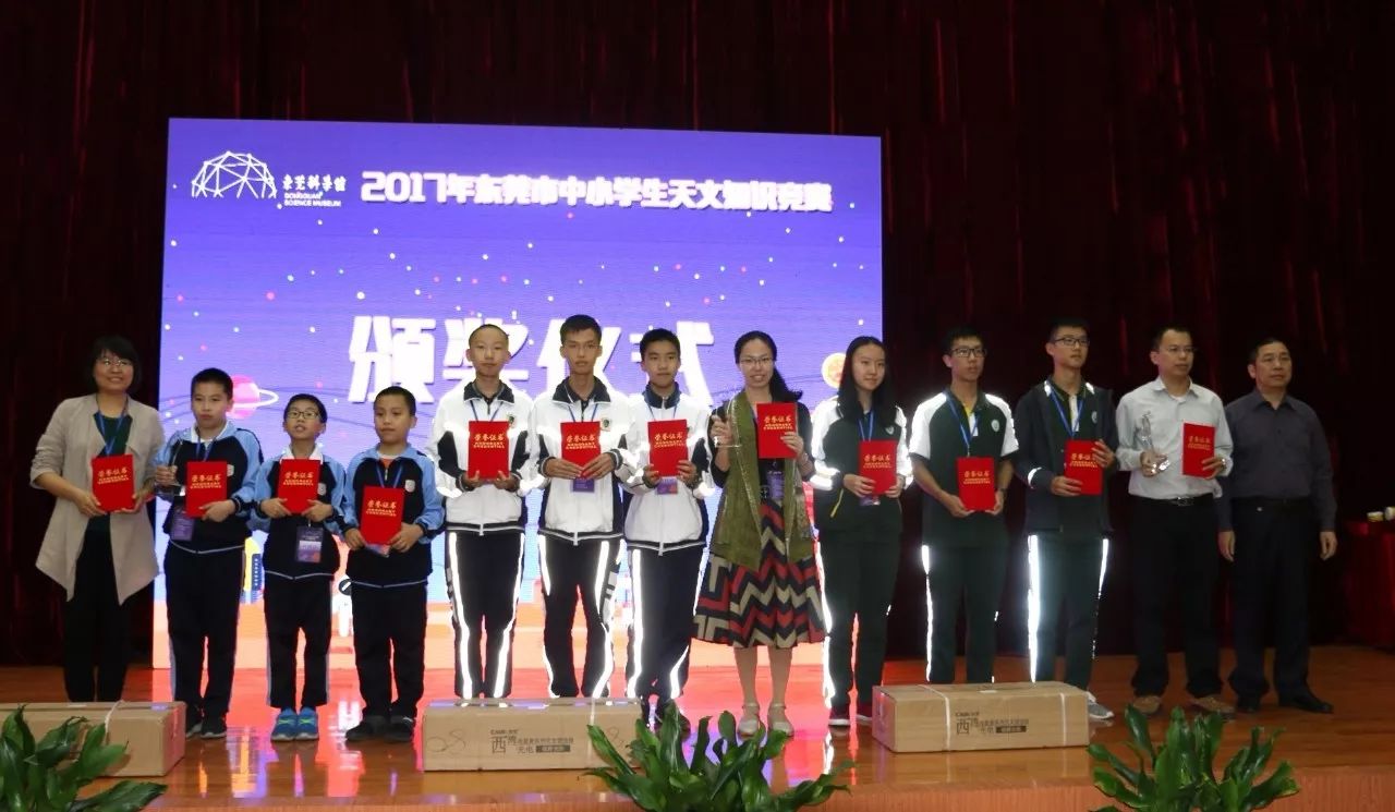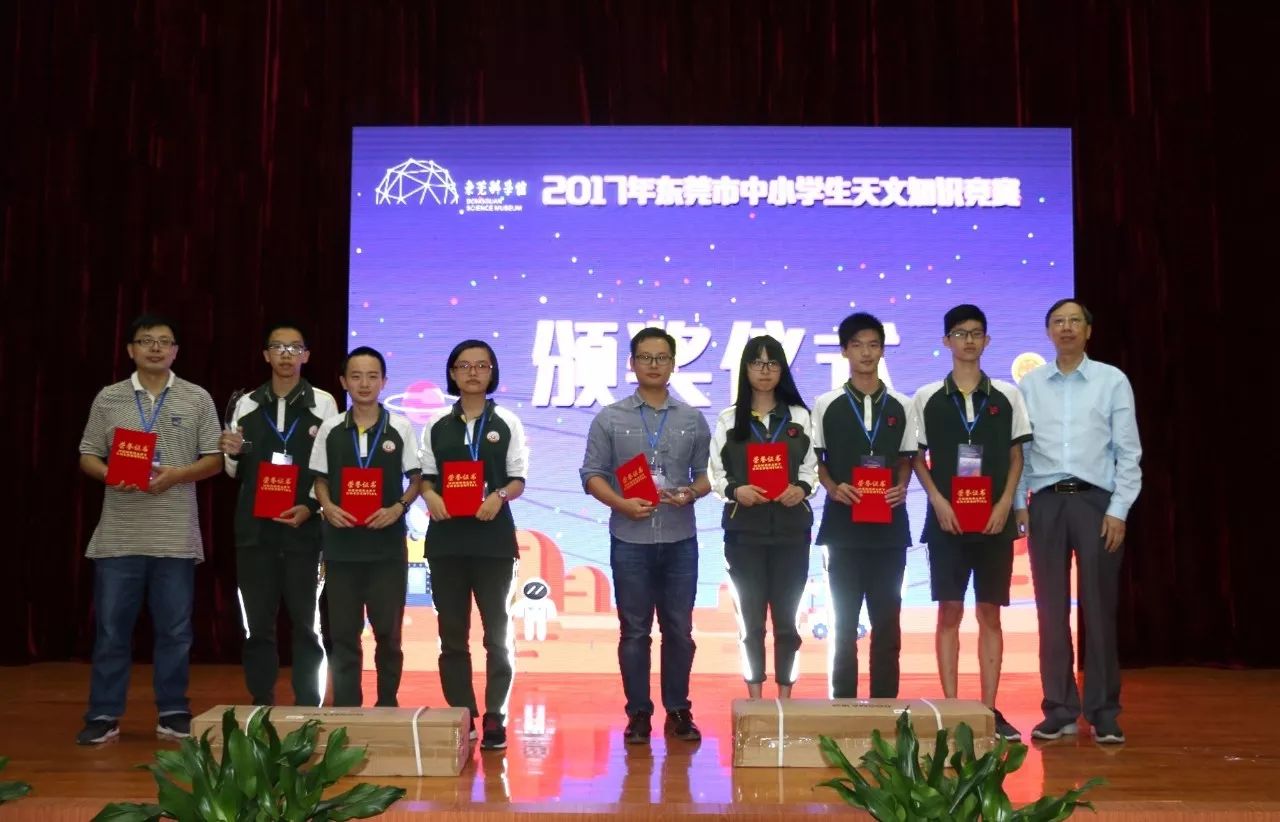 在竞赛的闭幕式上,市科协谭德阳副调研员、广东天文学会苏成悦教授、市教育局教研室严考全副主任,东莞科学馆馆长黄立强,东莞科学馆刘凤云副馆长等领导分别为获奖队伍进行颁奖。